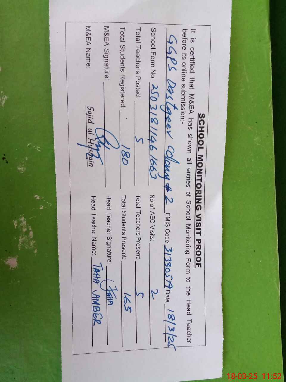 | EMIS Code: 31330519 | Name of School: GGPS DASTGEER COLONY NO. 2 | |||