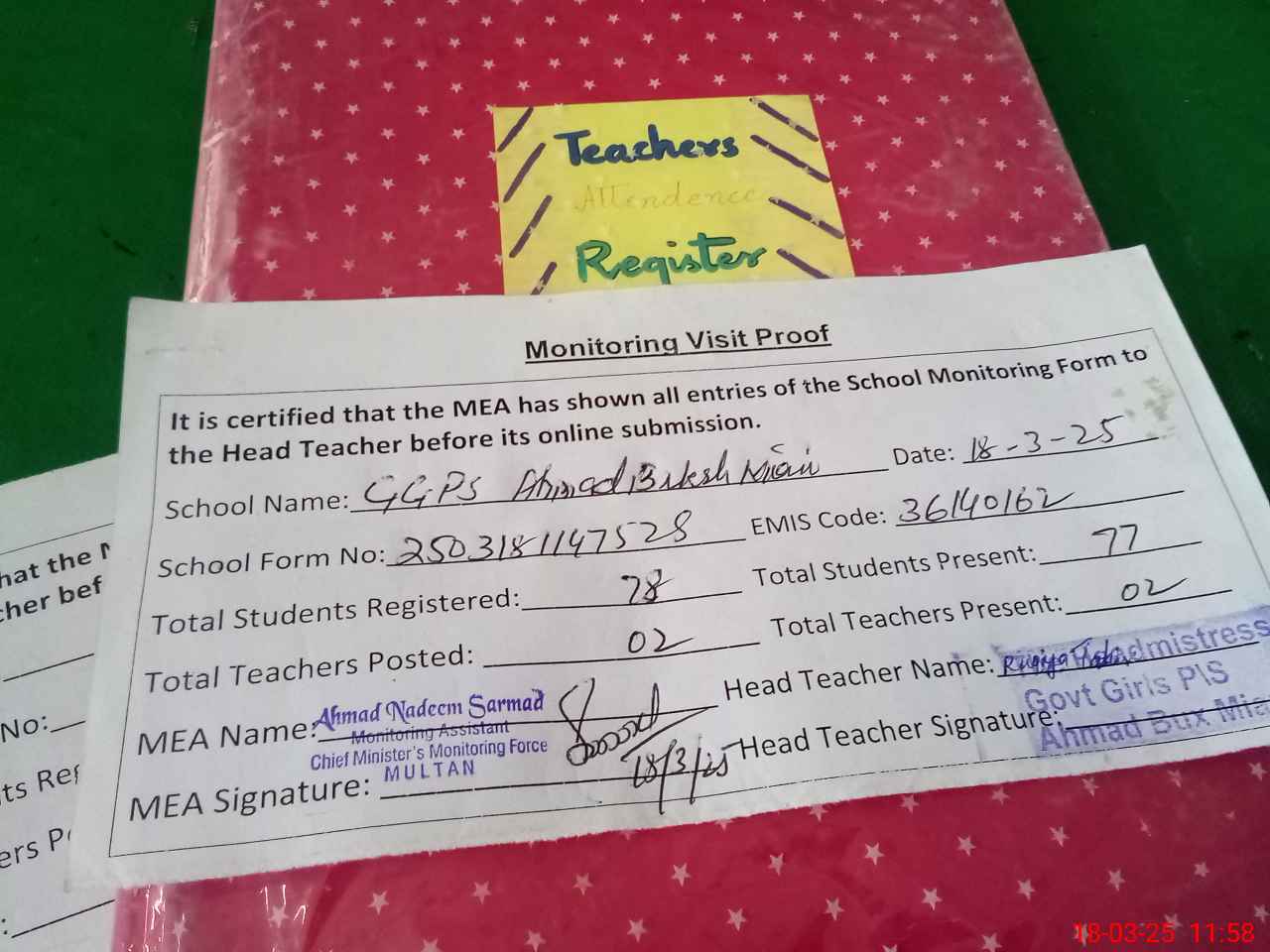 | Attendance Register | Head Teacher | MEA with School | Visit Proof |