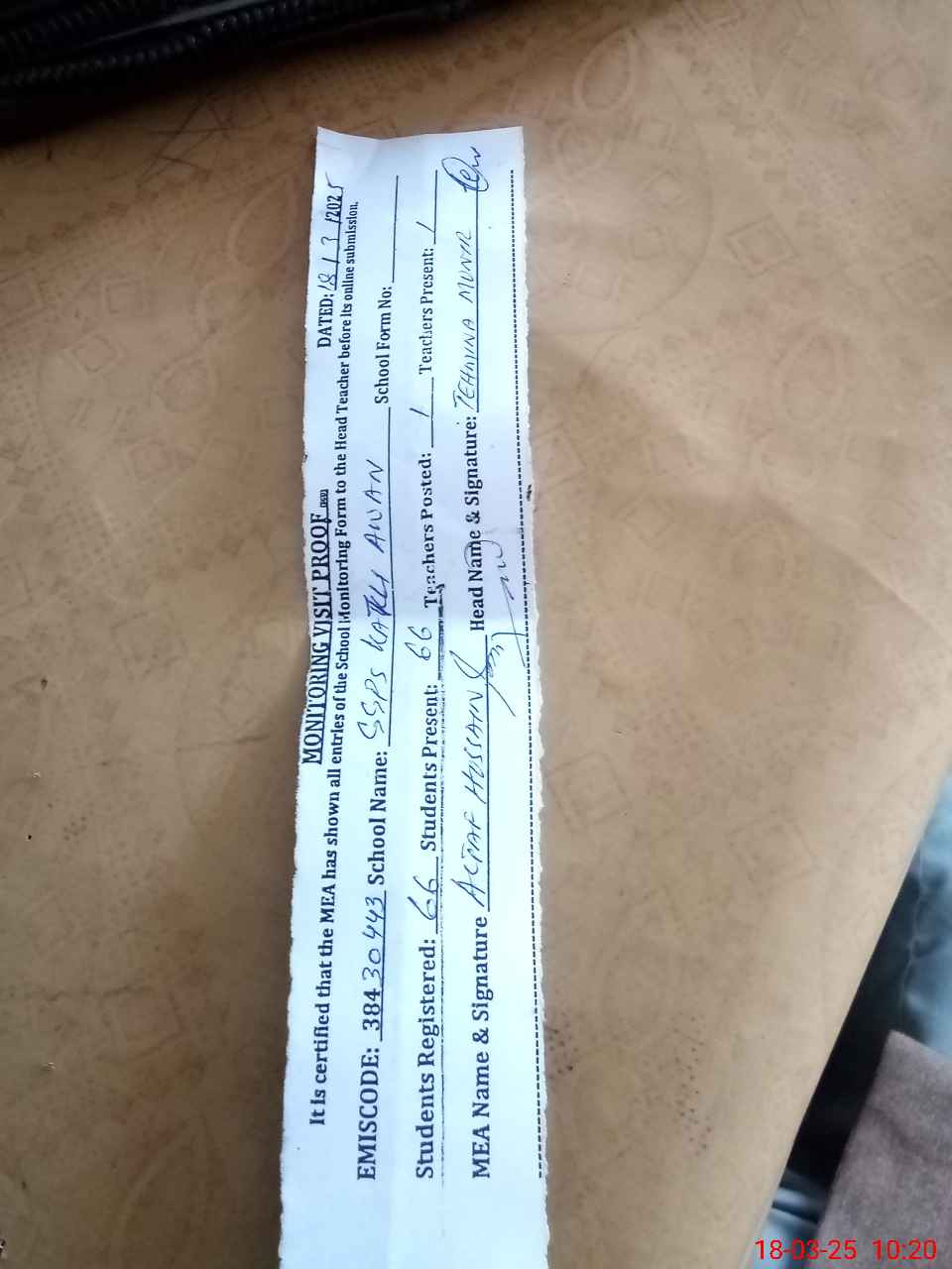 | Attendance Register | Head Teacher | MEA with School | Visit Proof |