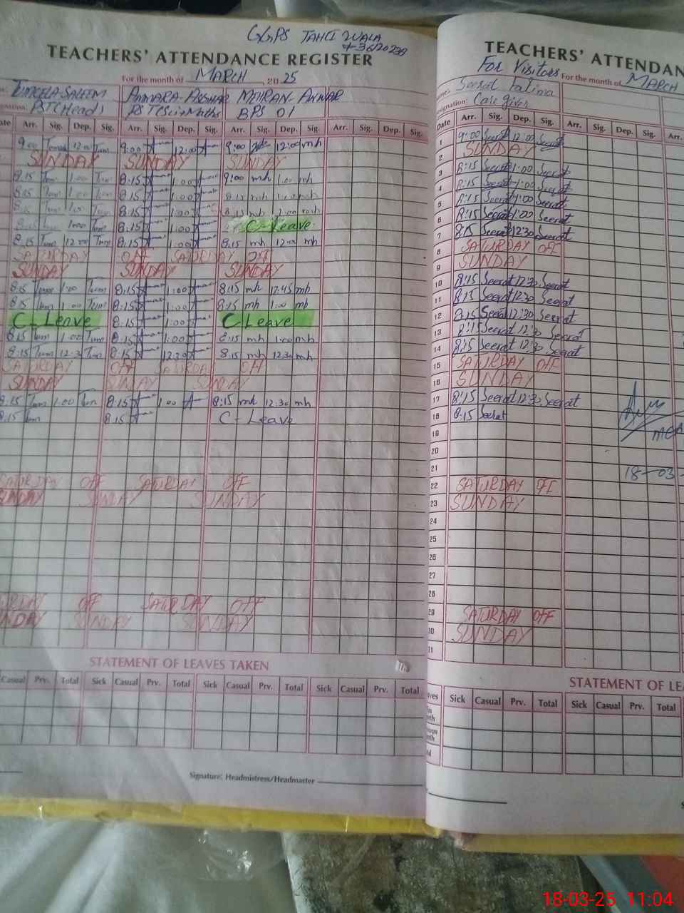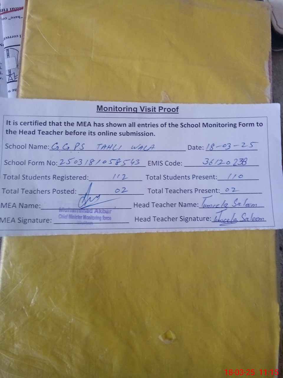 | Attendance Register | Head Teacher | MEA with School | Visit Proof |
