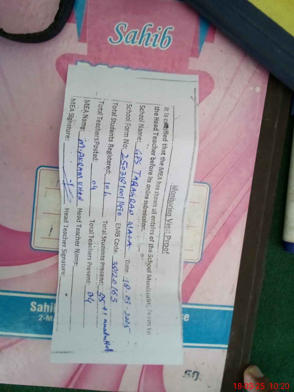 | Remarks (Use Separate Page if Required): Sir FTF record not maintain and no attendance on SIS and boundary wall not present from the east and south side of the school and further more head teacher refund to sign the visit report | |||||
