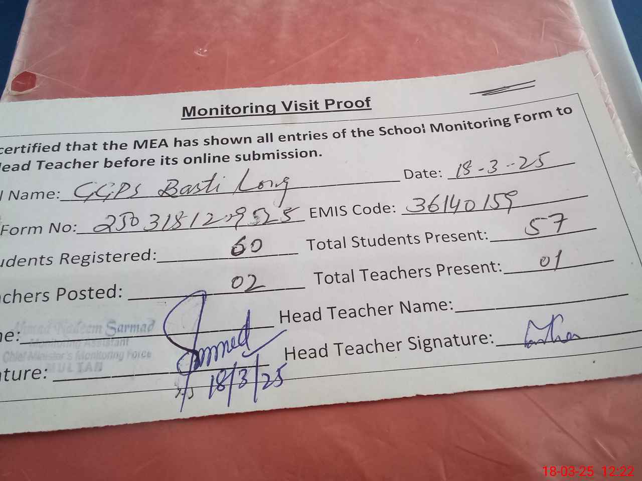 | Attendance Register | Head Teacher | MEA with School | Visit Proof |