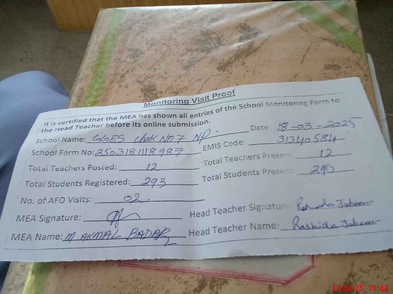 | EMIS Code: 31340584 | Name of School: GGES CHAK NO.7/NP | |||