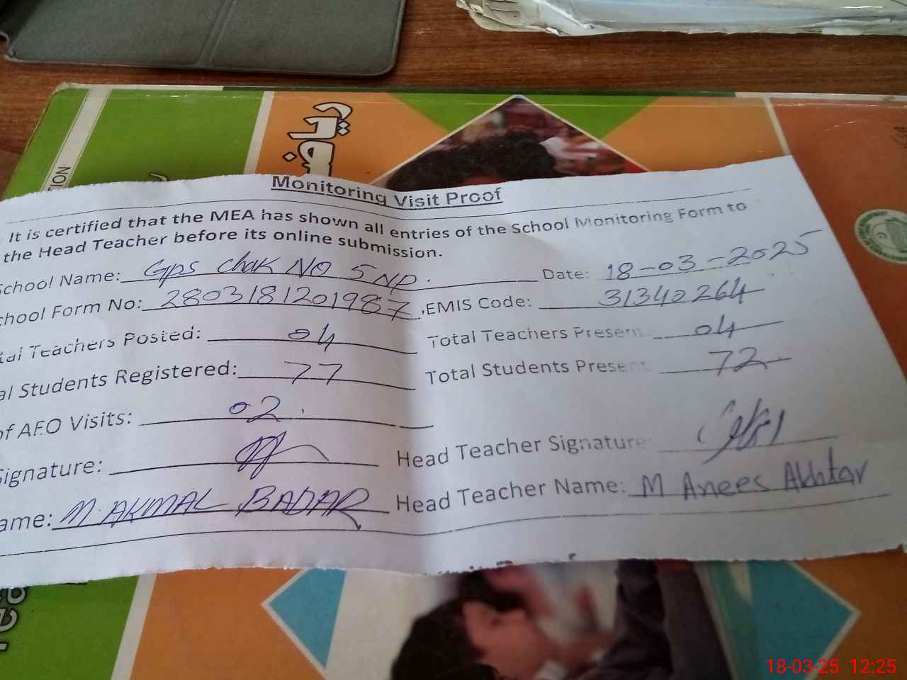| EMIS Code: 31340264 | Name of School: GPS CHAK NO. 5 NP | |||
