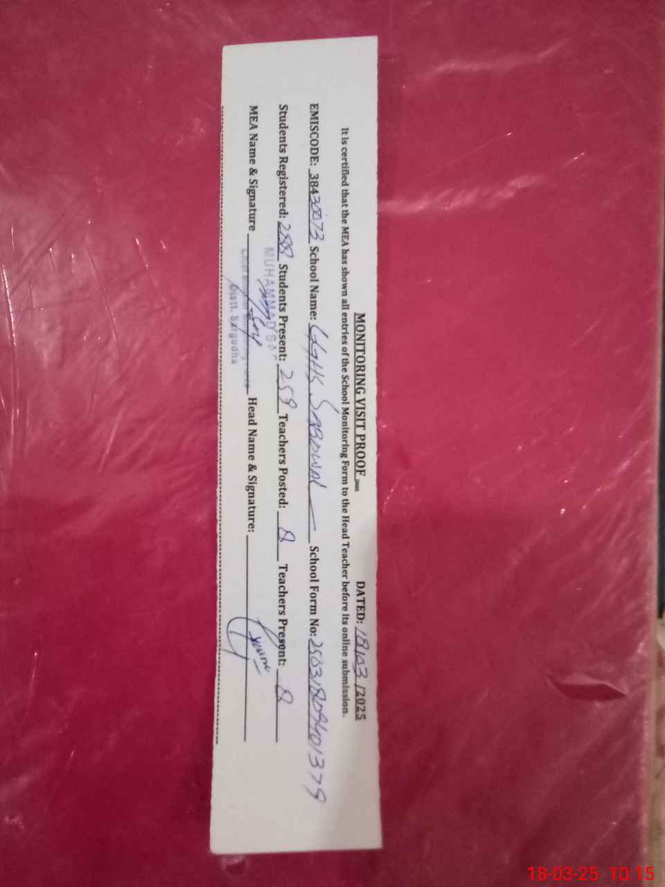 | Certified that this School was Inspected by the Undersigned MEA/DMO Today and the Information Stated Above is as Per Record. | |||||