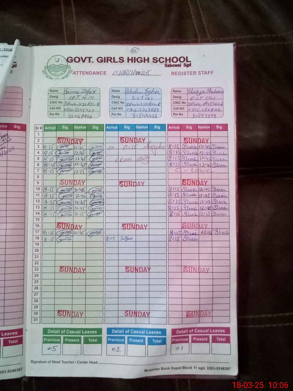 | CNIC | Full Name | Designation | R/C | Absence During Last Calender Month |