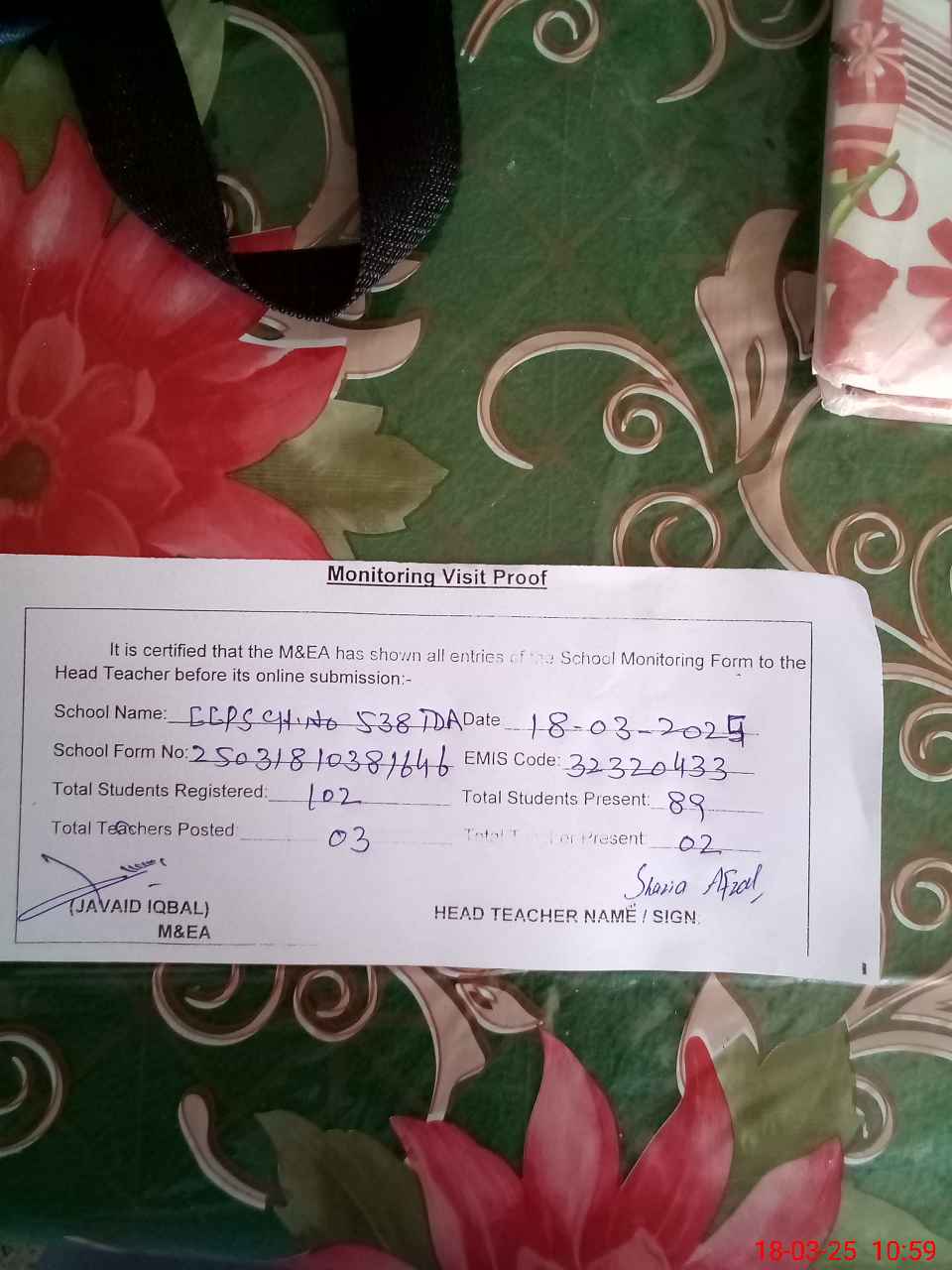 | Attendance Register | Head Teacher | MEA with School | Visit Proof |