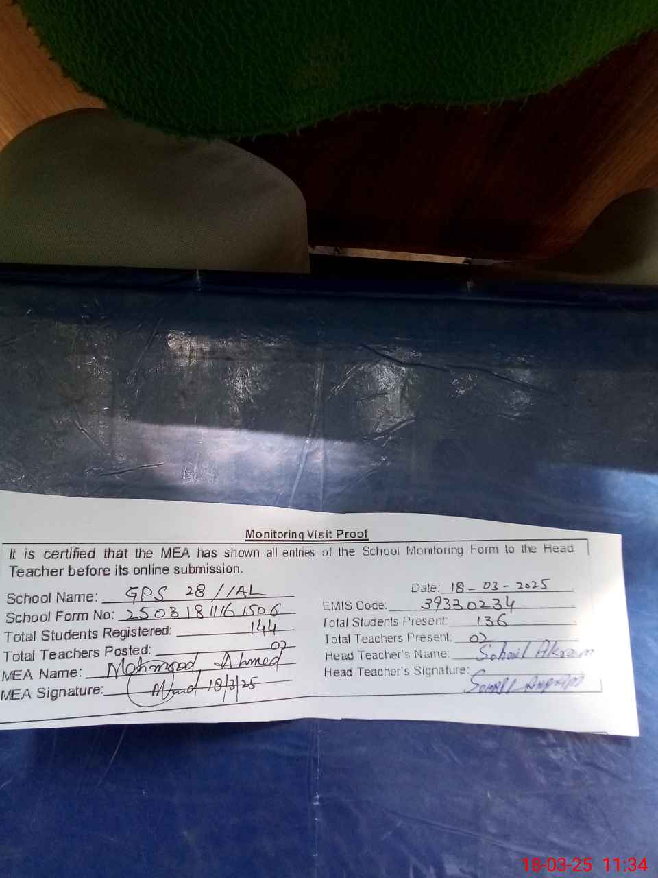 | Attendance Register | Head Teacher | MEA with School | Visit Proof |