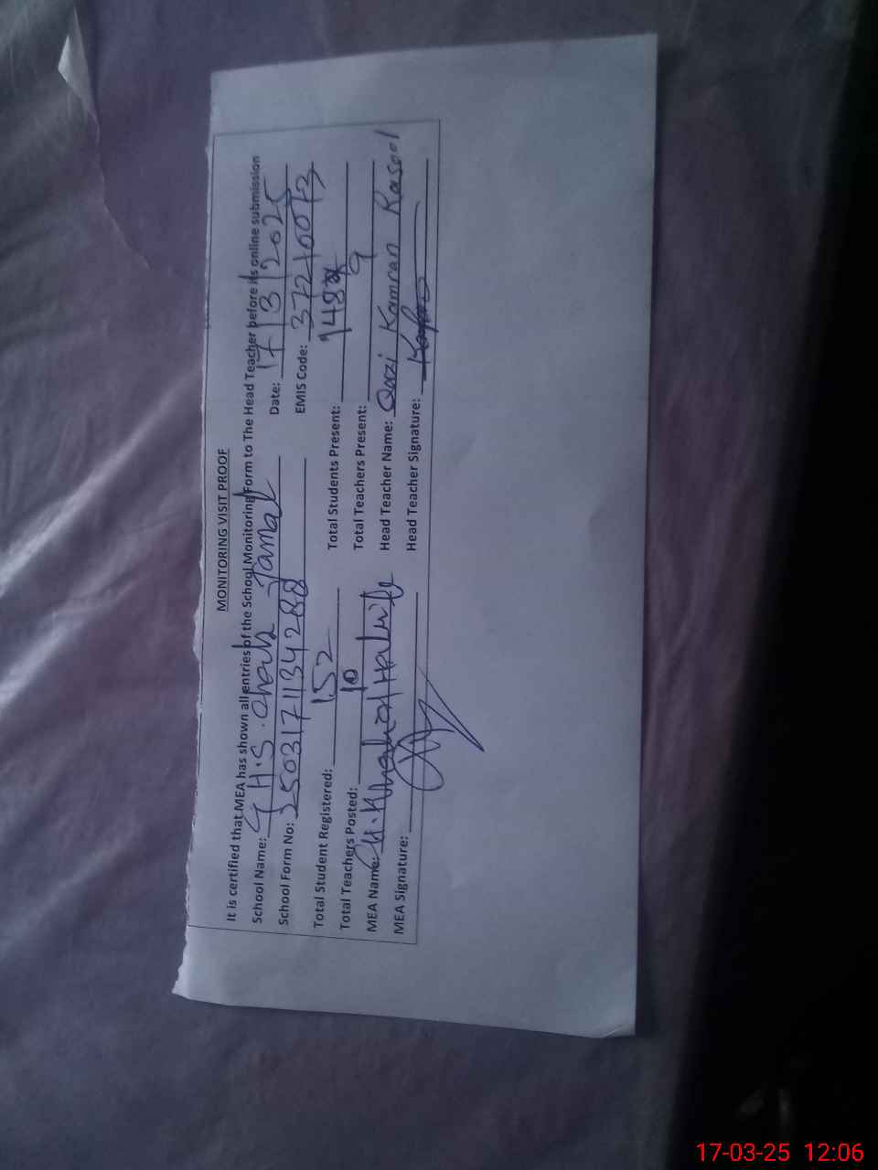 | Attendance Register | Head Teacher | MEA with School | Visit Proof |