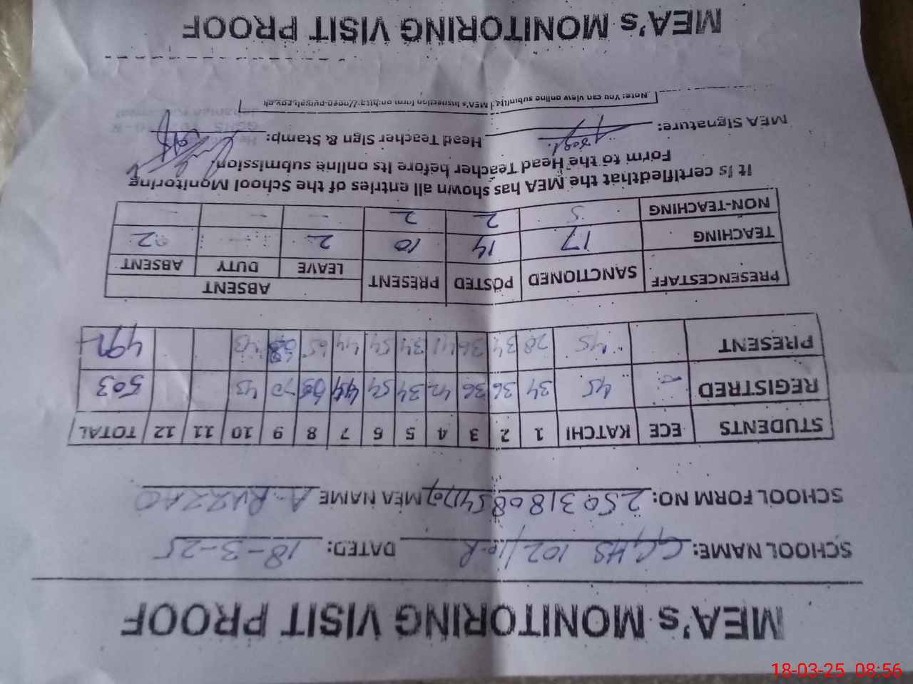 | Attendance Register | Head Teacher | MEA with School | Visit Proof |