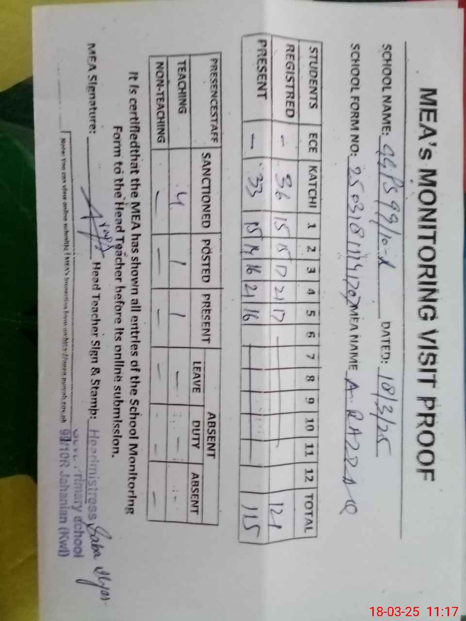 | Attendance Register | Head Teacher | MEA with School | Visit Proof |