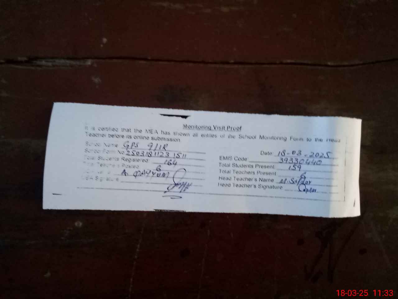 | Attendance Register | Head Teacher | MEA with School | Visit Proof |