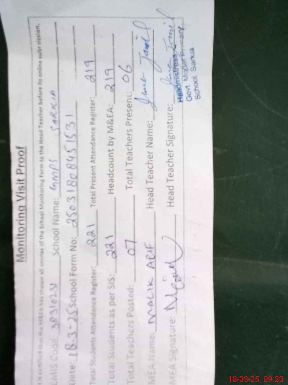 | Attendance Register | Head Teacher | MEA with School | Visit Proof |
