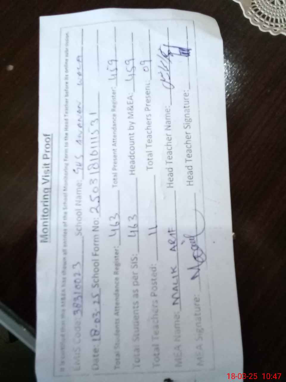 | Attendance Register | Head Teacher | MEA with School | Visit Proof |
