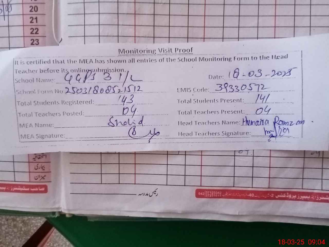 | Attendance Register | Head Teacher | MEA with School | Visit Proof |