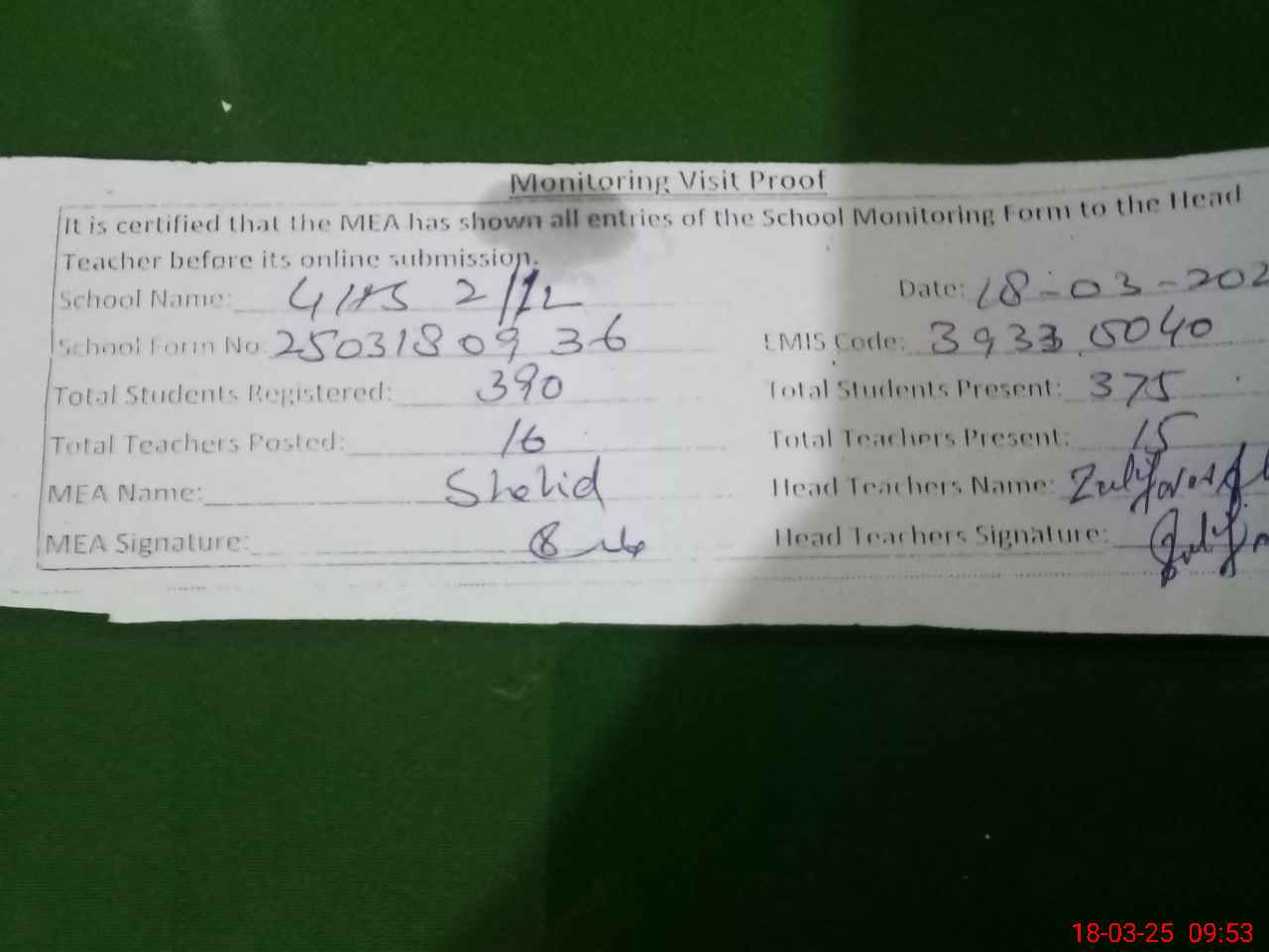 | Attendance Register | Head Teacher | MEA with School | Visit Proof |