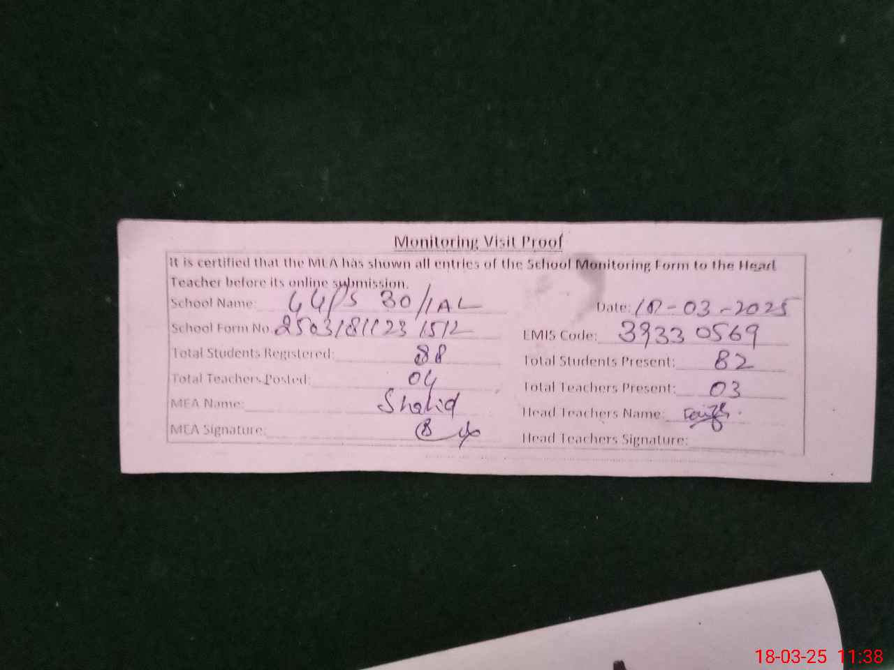 | Attendance Register | Head Teacher | MEA with School | Visit Proof |