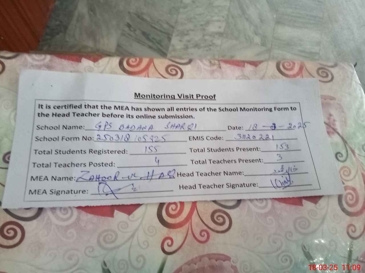 | Attendance Register | Head Teacher | MEA with School | Visit Proof |