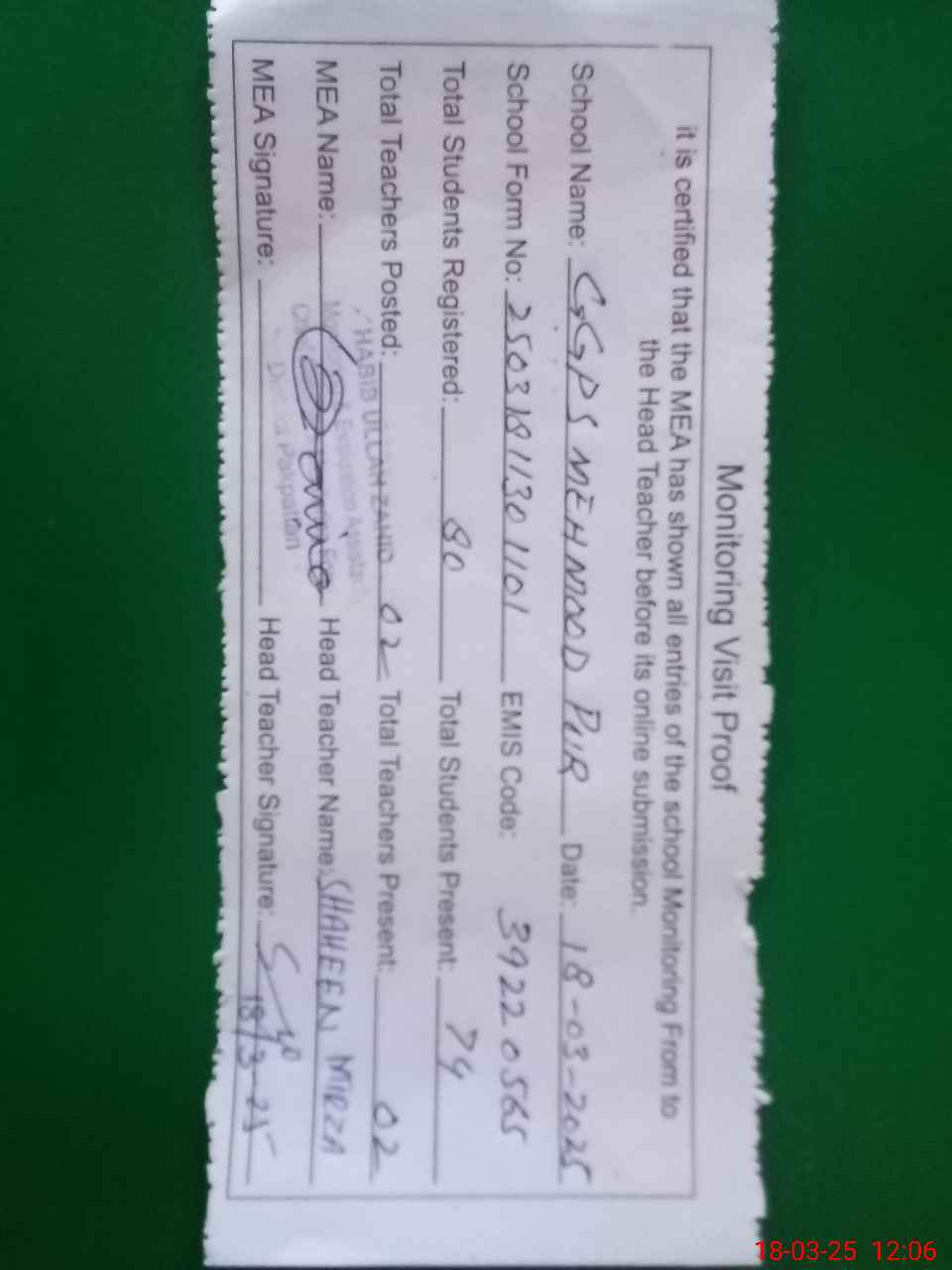 | Attendance Register | Head Teacher | MEA with School | Visit Proof |