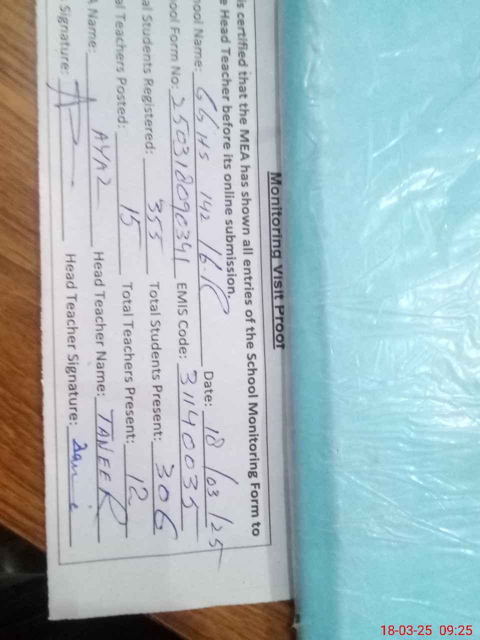 | Attendance Register | Head Teacher | MEA with School | Visit Proof |