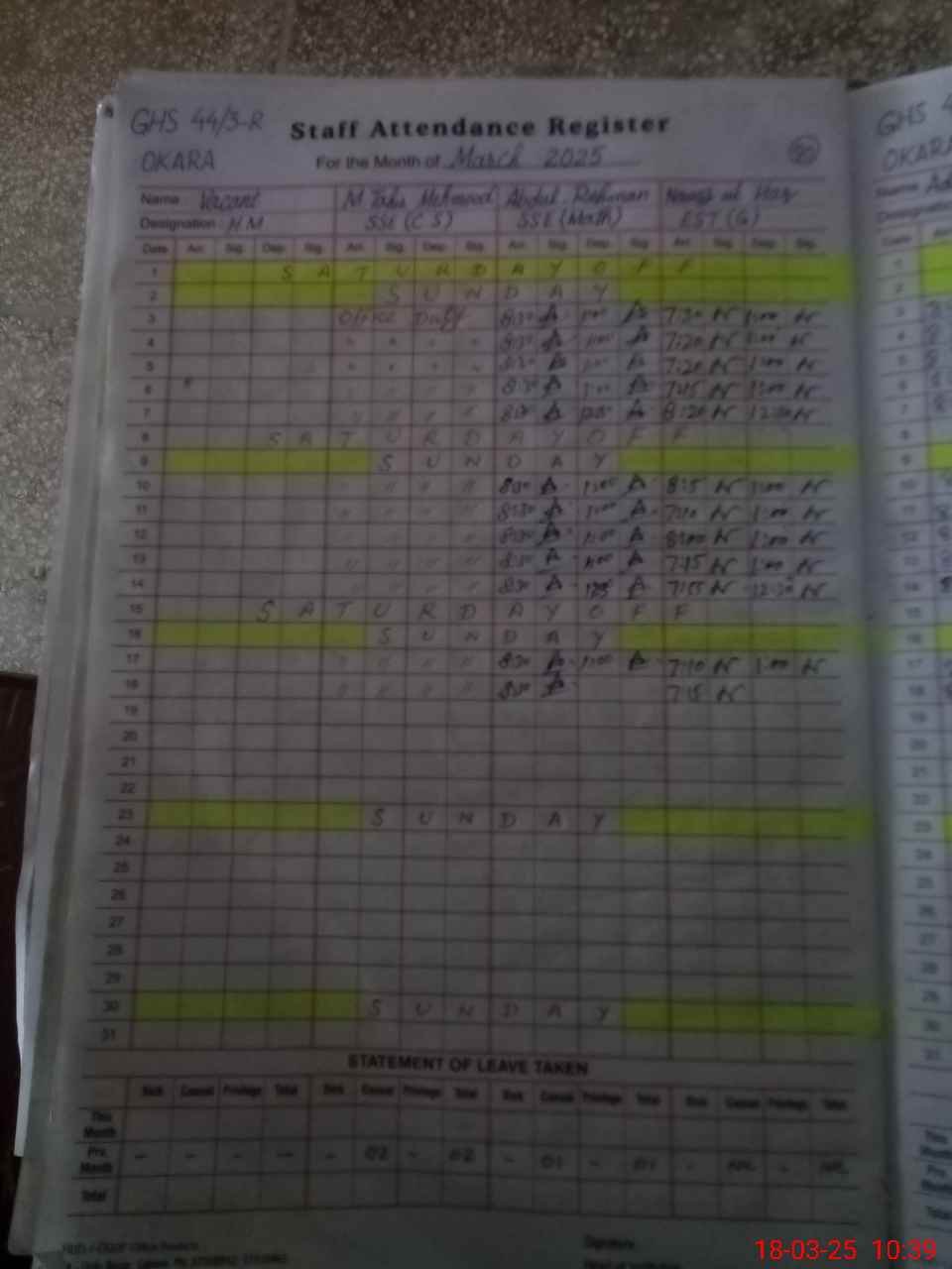 | 35**** | Mu**** Ad**** Ab**** | Regular | 1 | 0 | 0 | 0 | 0 | 0 | 0 | 0 | 1 | Exam Duty | |