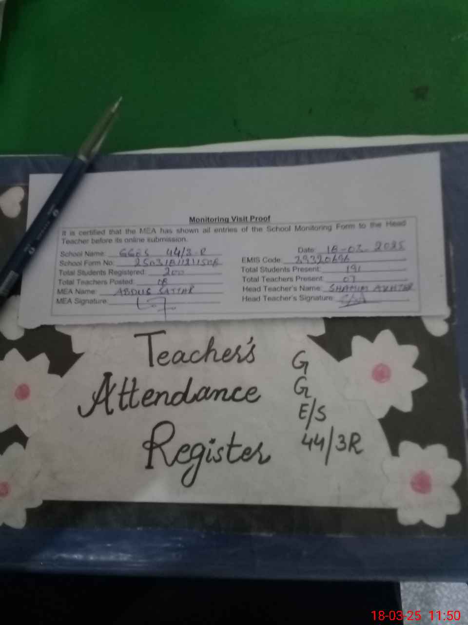 | Attendance Register | Head Teacher | MEA with School | Visit Proof |