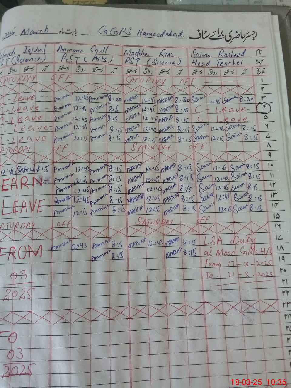 | 31**** | Sa**** Ra**** | 1 | 1 | 0 | 0 | 0 | 0 | 0 | 0 | 0 | 0 | 0 | Exam Duty |