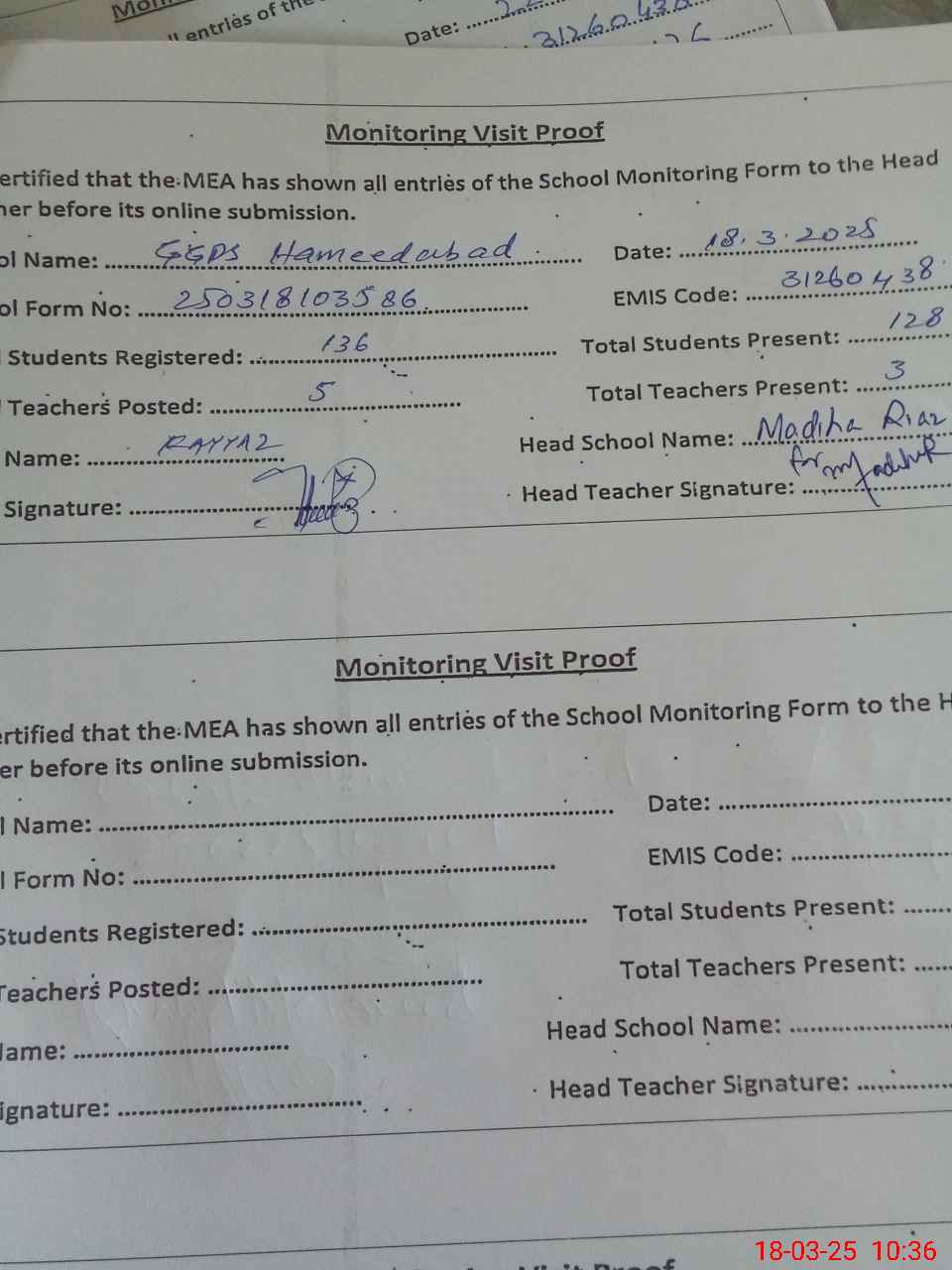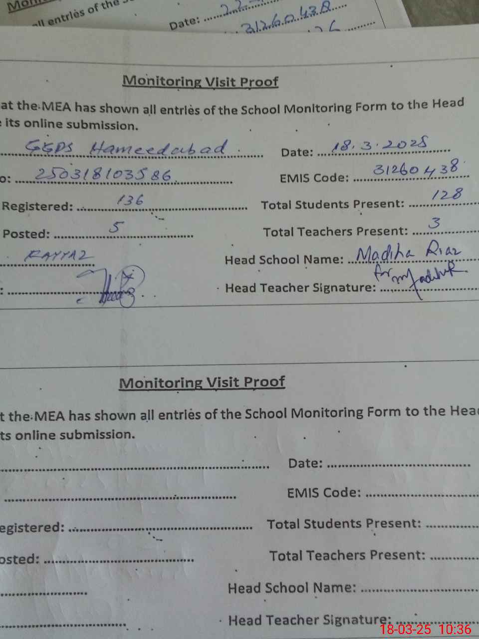 | Attendance Register | Head Teacher | MEA with School | Visit Proof |