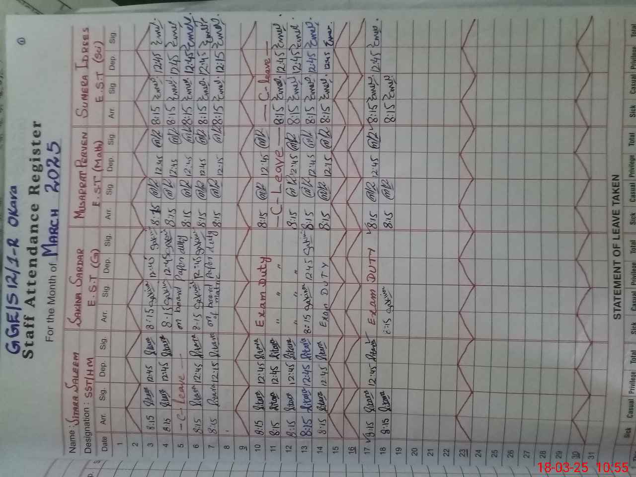 | Leave | Duty | Absent | Maternity | Medical | Ex- Pak |