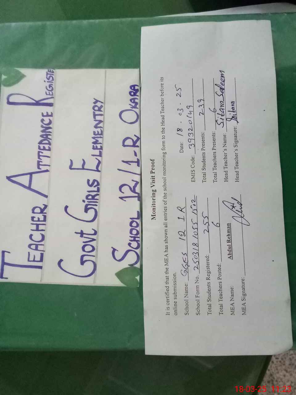 | Attendance Register | Head Teacher | MEA with School | Visit Proof |