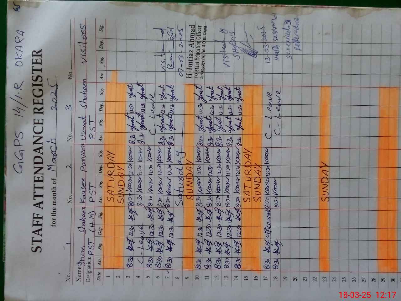 | School Visited by School Health & Nutrition Supervisor (No. of Visits) | 1 | Name1: | Rana Imran | Name2: | |