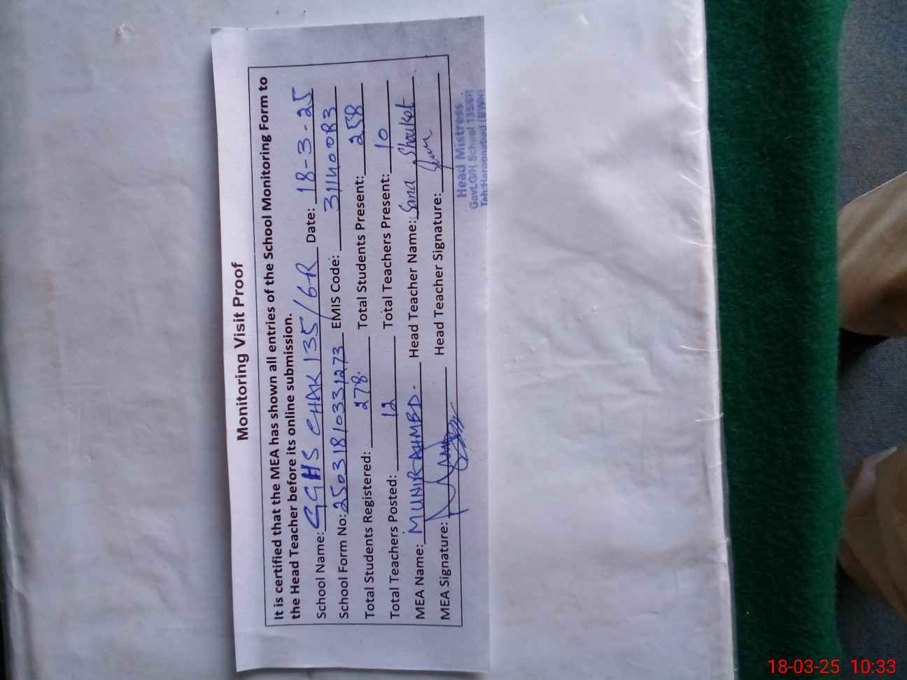 | EMIS Code: 31140083 | Name of School: GGHS CHAK NO 135/6-R | |||
