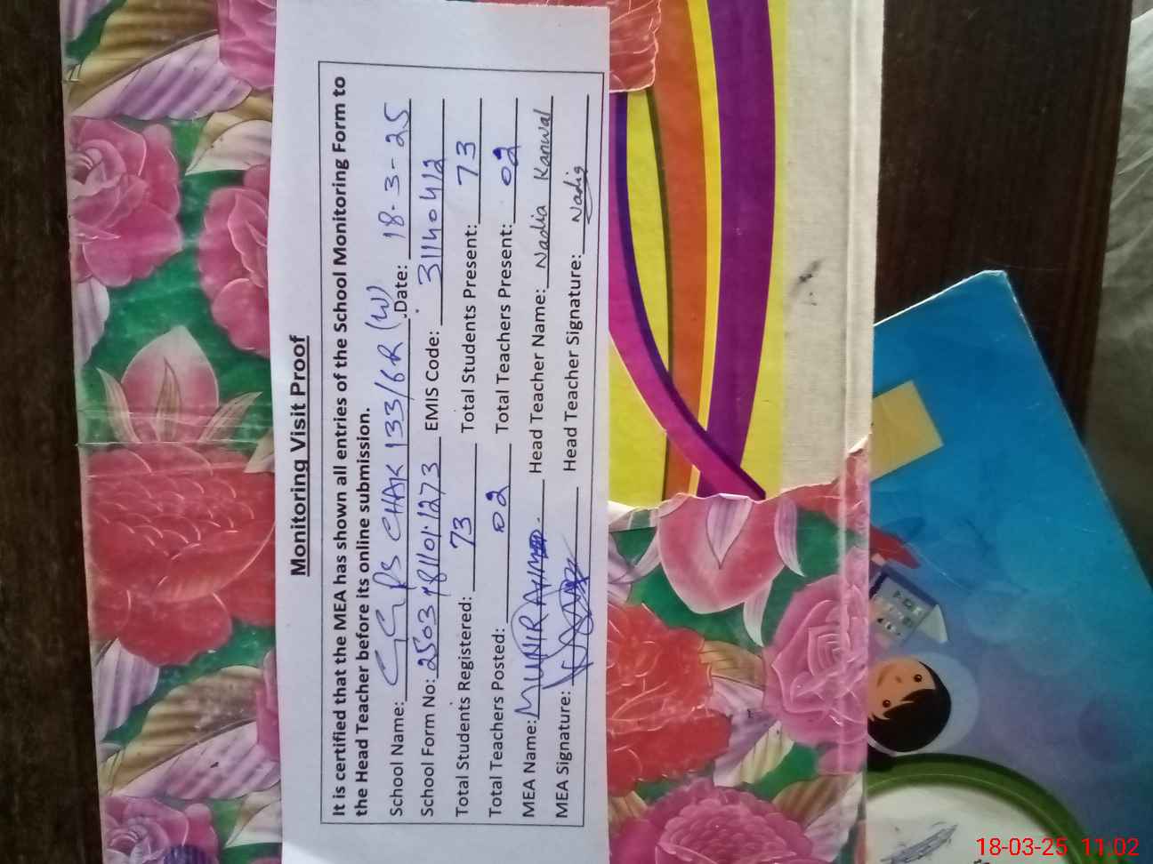 | Attendance Register | Head Teacher | MEA with School | Visit Proof |