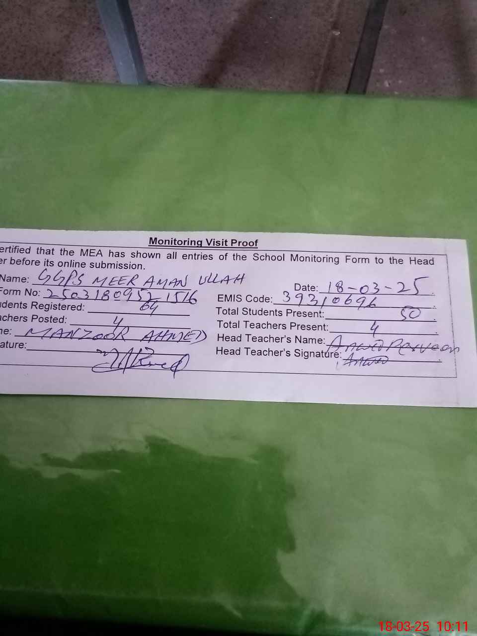 | Attendance Register | Head Teacher | MEA with School | Visit Proof |