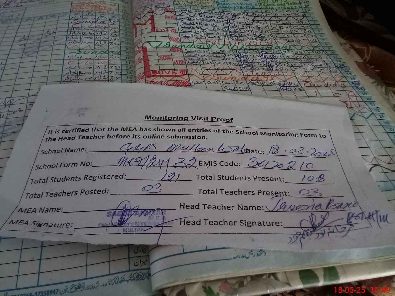 | EMIS Code: 36120210 | Name of School: GGPS MULLAN WALA SHUJABAD | |||