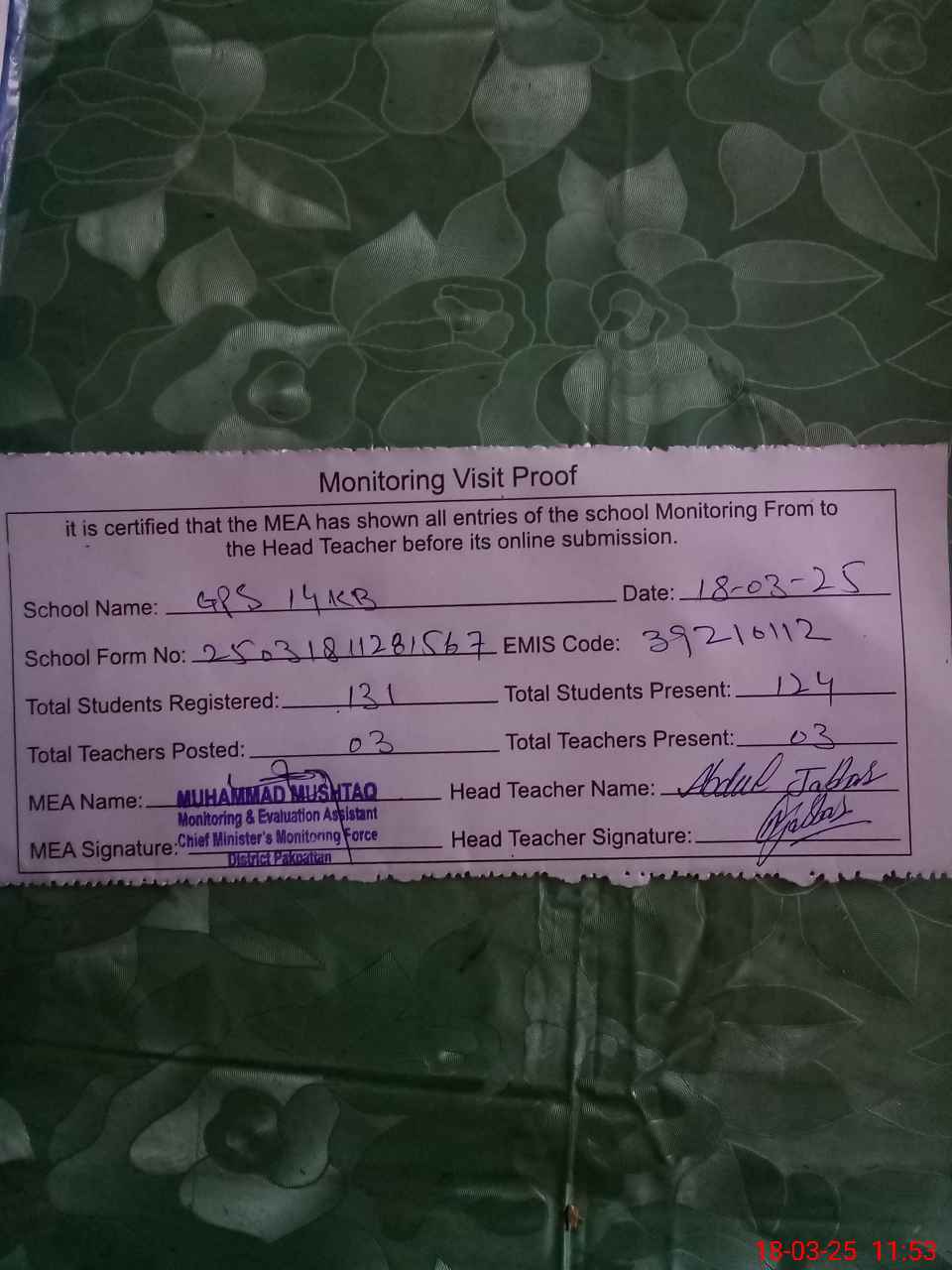 | EMIS Code: 39210112 | Name of School: GPS 14 KB P.O KALYANA | |||