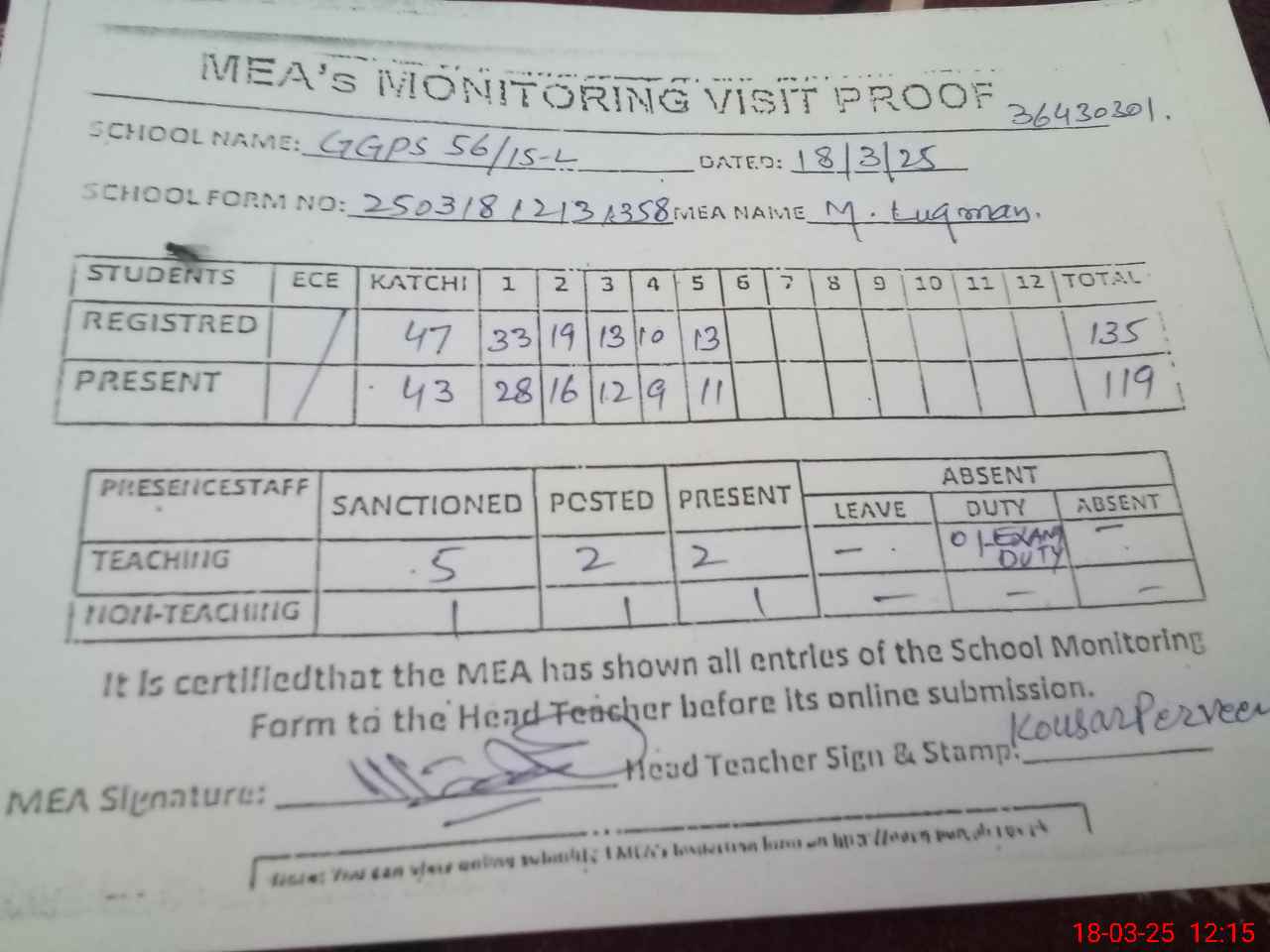 | Attendance Register | Head Teacher | MEA with School | Visit Proof |