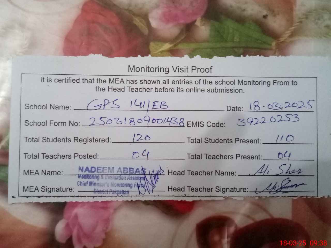 | EMIS Code: 39220253 | Name of School: GPS 141 EB | |||
