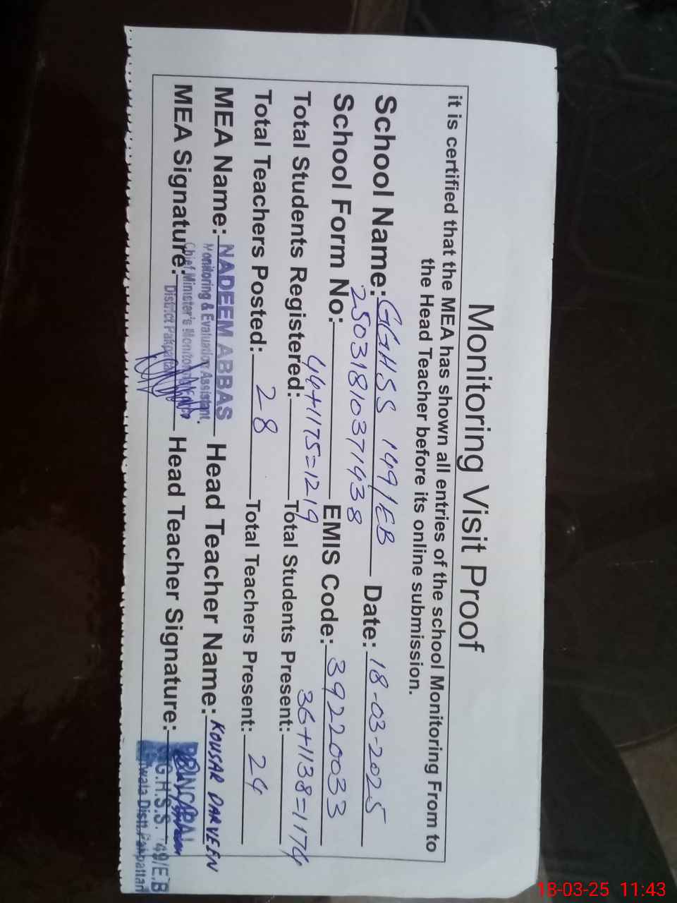 | EMIS Code: 39220033 | Name of School: GGHSS 149 EB ARIFWALA | |||