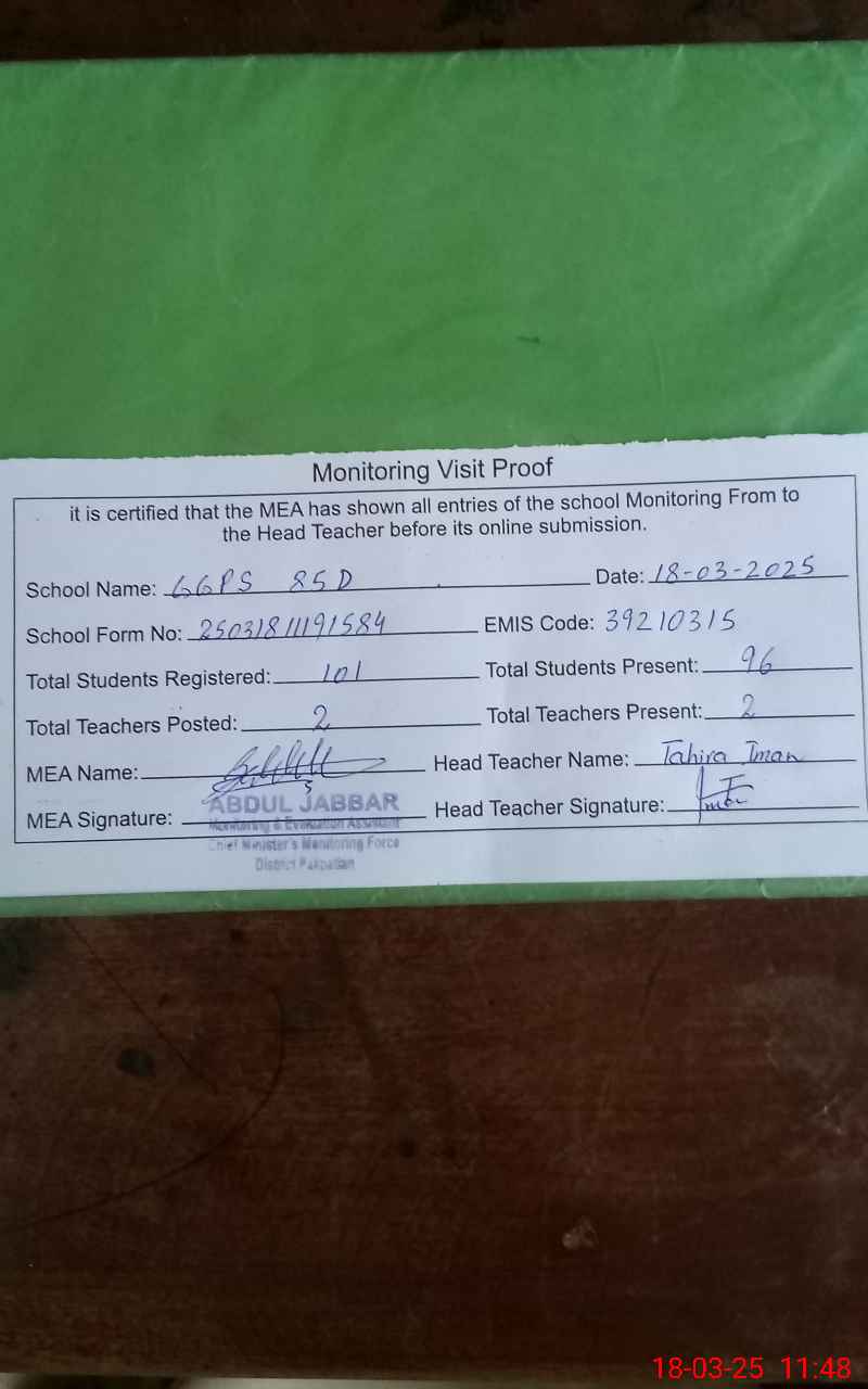 | EMIS Code: 39210315 | Name of School: GGPS 85 D | |||