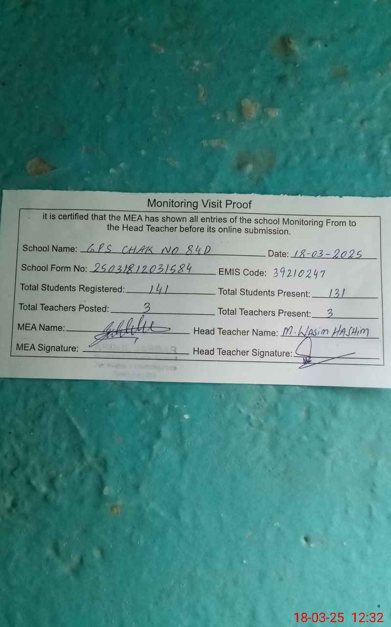 | EMIS Code: 39210247 | Name of School: GPS CHAK NO. 84 / D | |||