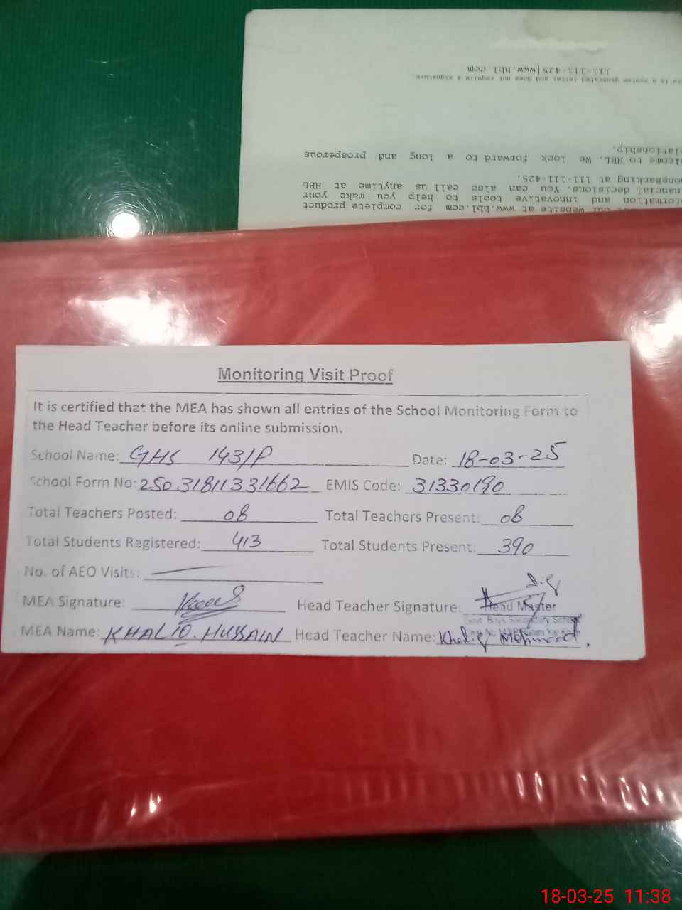 | Attendance Register | Head Teacher | MEA with School | Visit Proof |