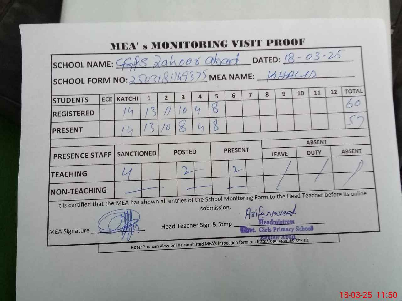 | Attendance Register | Head Teacher | MEA with School | Visit Proof |