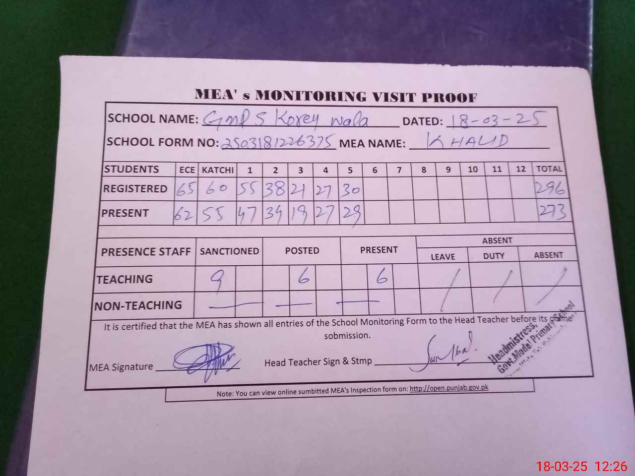 | EMIS Code: 36410383 | Name of School: GPS MODEL KOREY WALA, KABIRWALA | |||