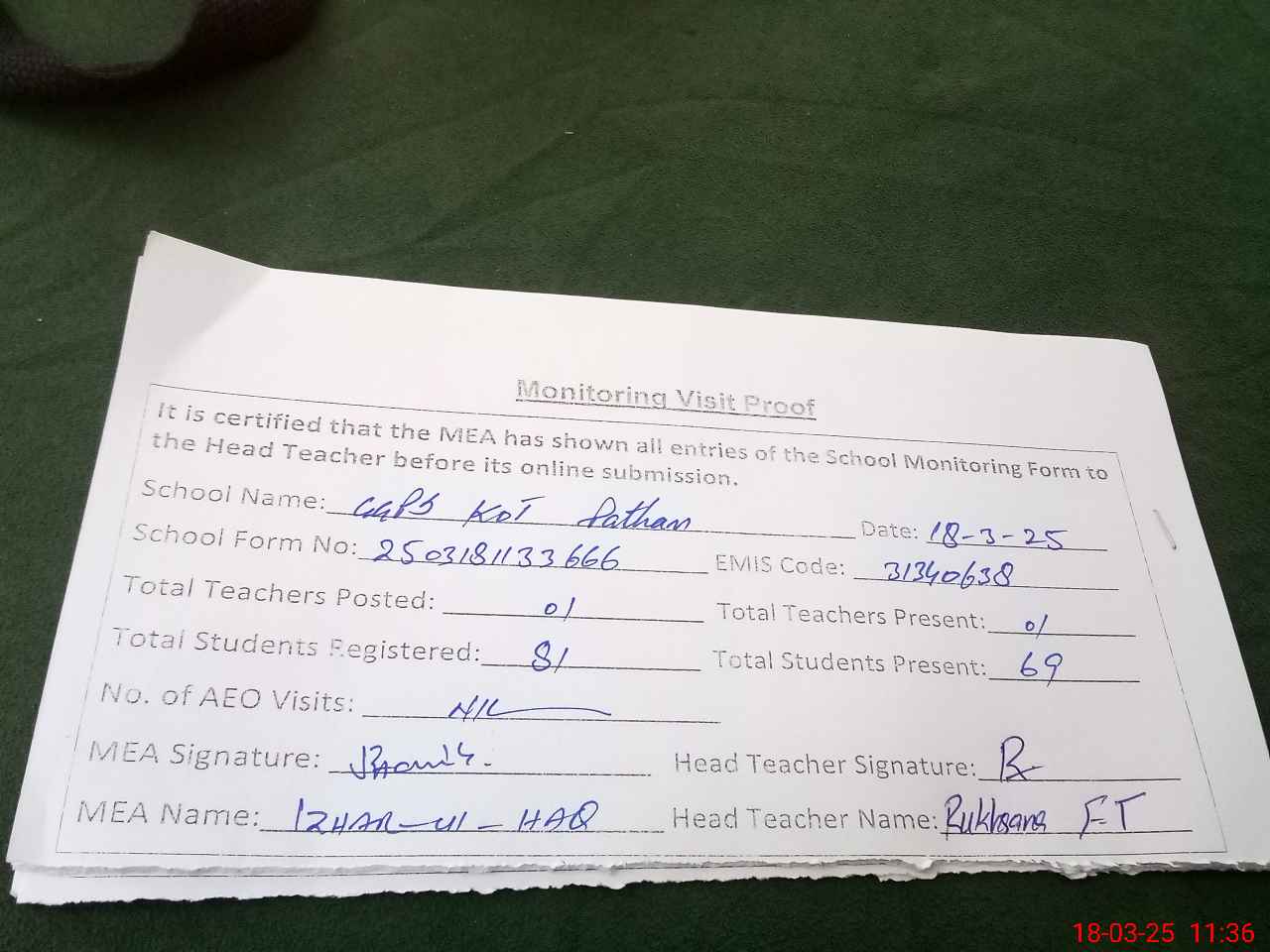 | Attendance Register | Head Teacher | MEA with School | Visit Proof |