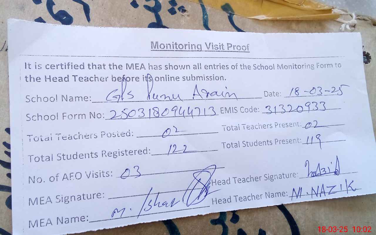 | EMIS Code: 31320933 | Name of School: GPS PUNU ARAIN | |||