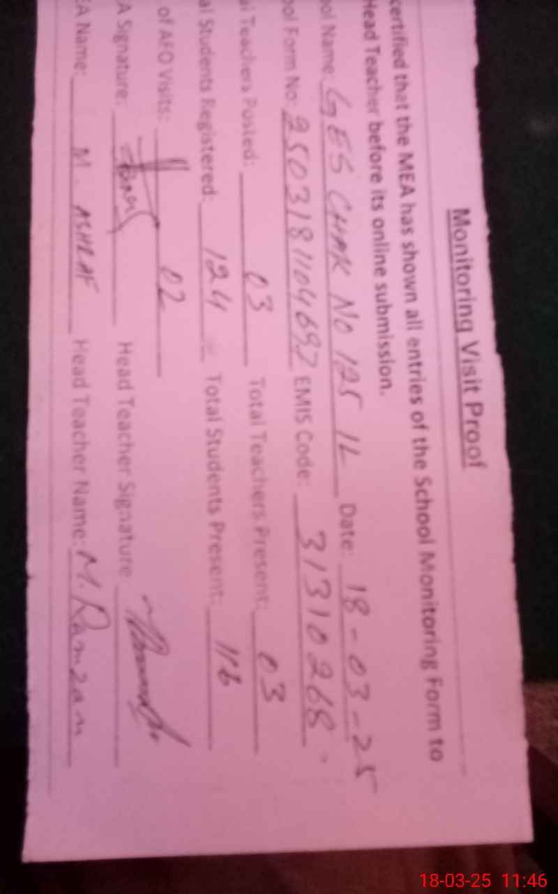 | EMIS Code: 31310268 | Name of School: GES CHAK NO.125/1-L | |||