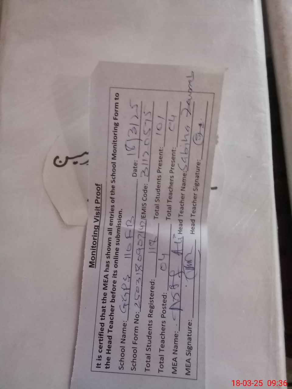 | Attendance Register | Head Teacher | MEA with School | Visit Proof |