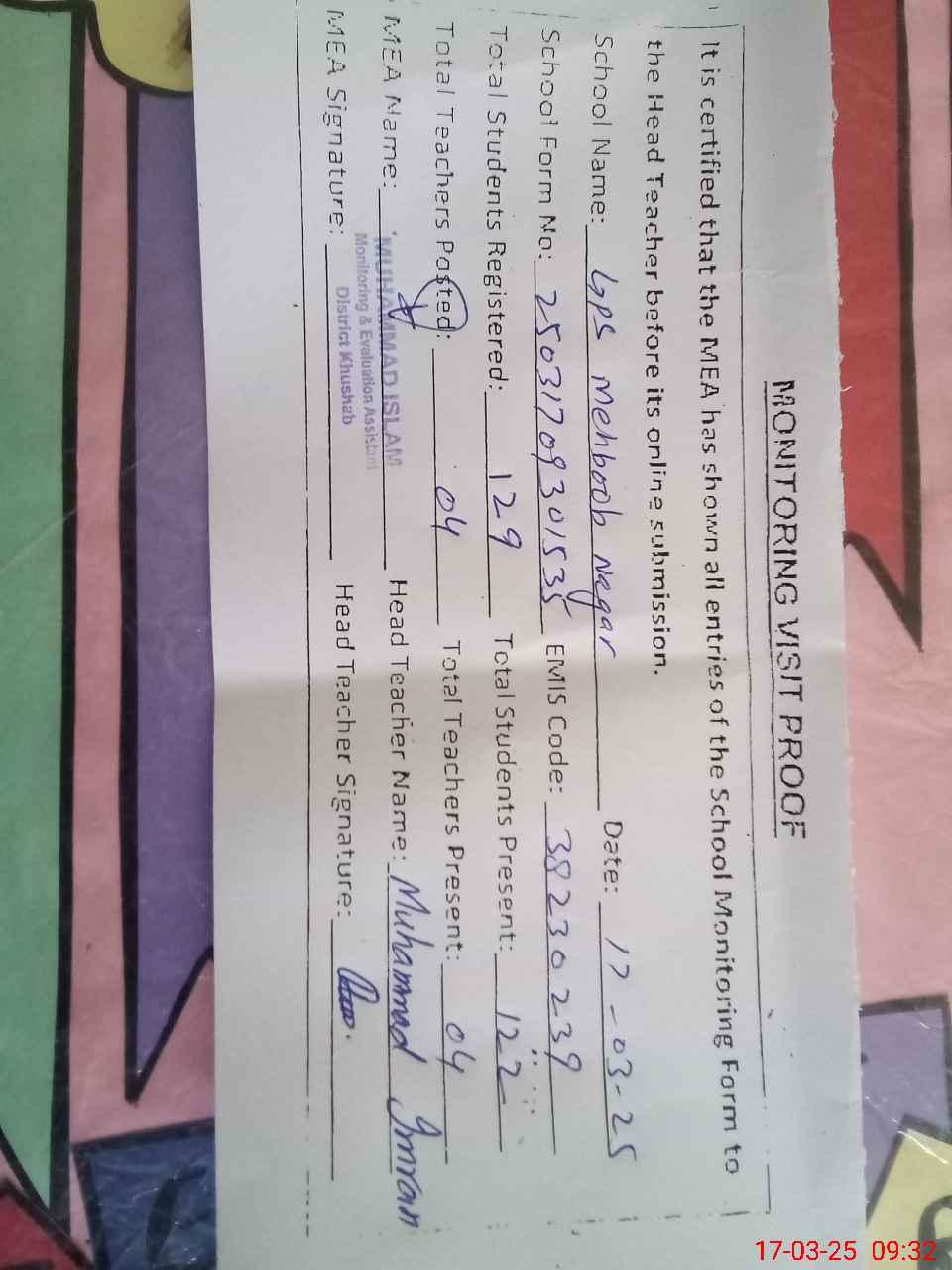 | Attendance Register | Head Teacher | MEA with School | Visit Proof |