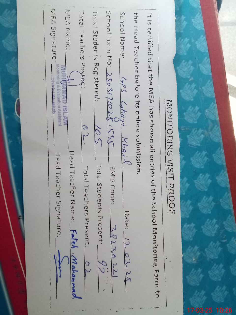 | Attendance Register | Head Teacher | MEA with School | Visit Proof |